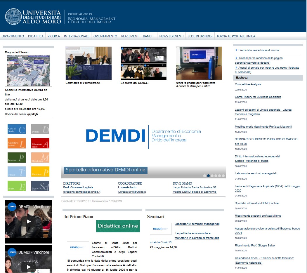 PER TUTTE LE DISCIPLINE MENO LE LINGUE STRANIERE. ANNO ACCADEMICO 2021 - 2022. 20212022 27072021 Competenze trasversali 03052021 Servizio di Counseling Psicologico UniBA - Emergenza Covid-19 22032021 Comunicato lezioni esami e sedute di laurea a distanza 14032021 Calendario Webinar Cliniche Legali 25012021 Recapiti ed info utili Segreterie 13012021.